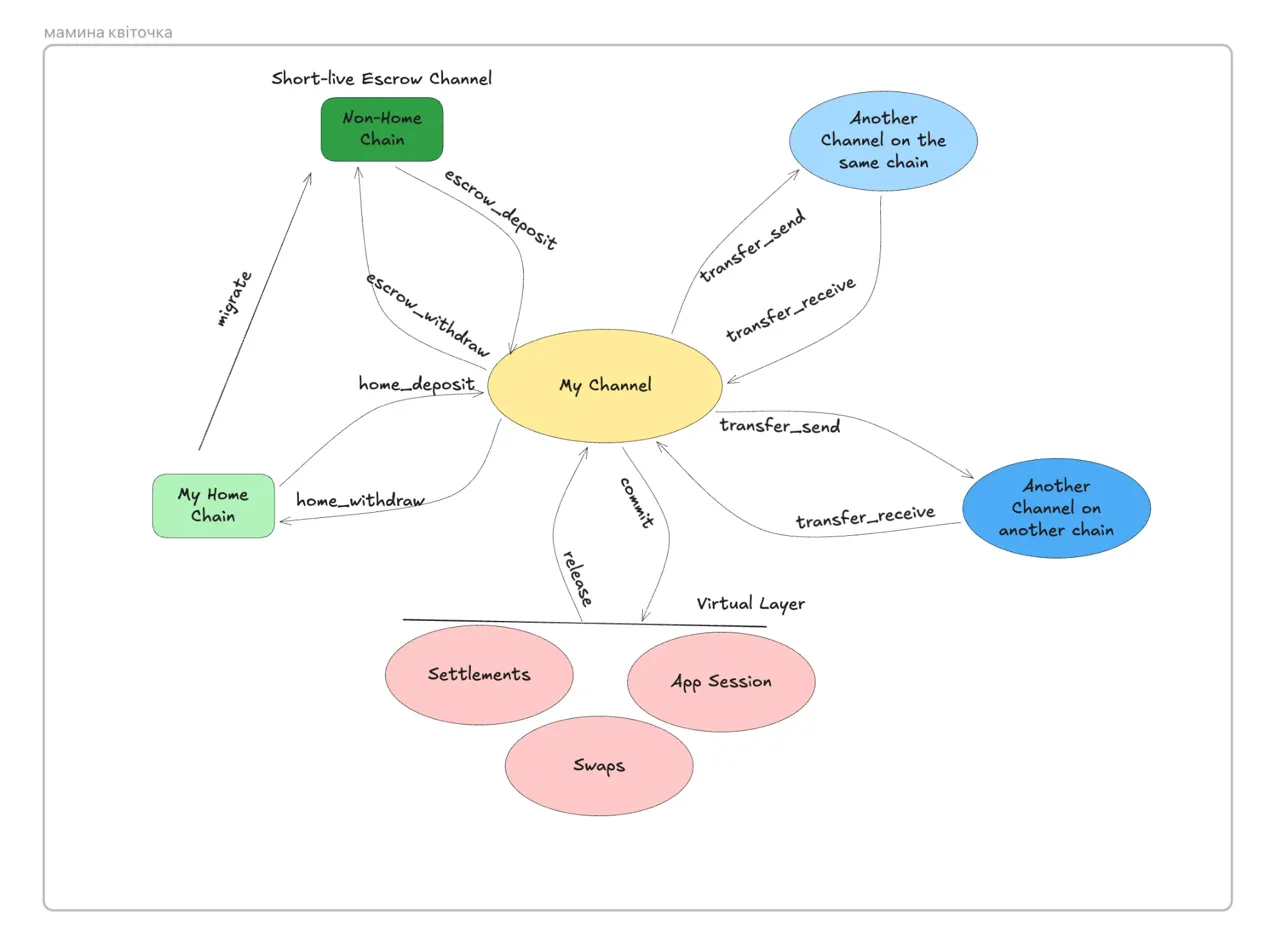 The Petal Diagram is the central architectural reference for the Nitrolite Protocol. It maps how different actions -- Deposits, Withdrawals, Transfers, and App Sessions -- interact with various blockchains, all centered on a user's channel ("My Channel").